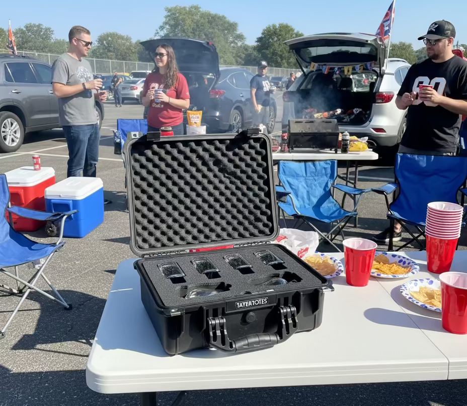 The Medium Travel Case from Tater Totes will turn heads and evoke envy at your next bottle share, tailgating event, or camping trip. With (4) 250 ml flasks and (2) Glencairn whiskey glasses, you will be ready for your next solo trip, meetup, or family vacation.